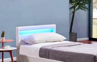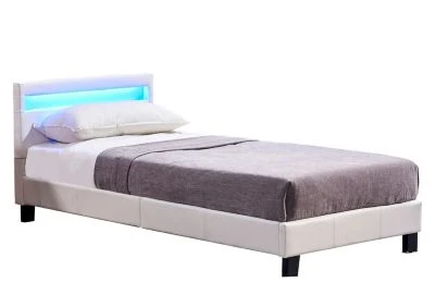 Einzelbett Jugendbett inkl. LED BeleuchtungUnser Einzelbett sorgt mit seinem modernen Design für eine schöne Ambiente in Ihrem Schlafzimmer. Die helle und freundliche Optik fügt sich ideal in modern eingerichtete Schlafzimmer ein. Durch die LED Beleuchtung mit Fernbedienung schalten Sie die Ambiente mit einem Klick ein und aus. Die Beleuchtung kann ganz nach Ihren Vorlieben farblich und nach Helligkeit angepasst werden. Die Lattenabstände sind so optimiert, dass Sie zu allen handelsüblichen Matratzen passen. Ein optimaler Abstand zwischen den Latten sorgen für eine gute Atmung der Matratze. das Einzelbett ist auch für das Jugendzimmer geeignet.Technische DatenDas Jugendbett hat eine Stellfläche von ca.: B97 / H79 / L213 cm. Das Bettrahmen hat eine Höhe von ca.: 26 cm. Die Höhe des Lattenrostes beträgt ca.: 25,5 cm. Die maximale Belastbarkeit beläuft sich auf ca.: 150 kg. Der Bezug der Kopf und Fußseite sowie die Seitenteile besteht aus pflegeleichtem Kunstleder ( 100 % Kunstleder ) .LieferumfangIm Lieferumfang ist das Einzelbett Jugendbett 90 x 200 cm, Lattenroste zum Einsetzen in die Führungen, LED Beleuchtung inkl. Fernbedienung, Montageanleitung und Montagematerial enthalten. ACHTUNG: Die Dekoration, Matratzen und Zubehör ist nicht Bestandteil des Angebotes.