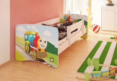 Dieses Bett wurde aus hochwertigen Spanplatten hergestellt und verfügt über bunte Aufdrücke auf den Fronten. Die Seitenteile sind weiß. Der Aufdruck wurde aus ökologischen Farben angefertigt und zusätzlich laminiert, deshalb verblassen die Farben nicht und können nicht weggewischt werden. Die Bettkanten besitzen einen speziellen Überzug und schützen ihr Kind somit vor Verletzungen. Der Rausfallschatz verhindert, dass Ihr Liebling während des Schlafs aus dem Bett fällt.Die besondere Herstellung und hochqualitative Materialien sorgen dafür, dass alle von uns angebotenen Bettchen sehr stabil und robust sind. Der Lattenrost besteht aus 2 cm dicken Querstäben aus Holz und hält max. 150 kg Körpergewicht aus. Ein Elternteil kann problemlos auf dem Bett sitzen oder sogar auch mit dem Kind liegen. Schaumstoffmatratze mit Überzug mit Reißverschluss (10 cm dick).Der Rausfall-,Seitenschutz können beidseitig angebracht werden. Das Bett kann somit an jedes Kinderzimmer angepasst werden. Die beiden Schutzteile können jederzeit abmontiert werden, ohne dass das Bett an Stabilität verliert.