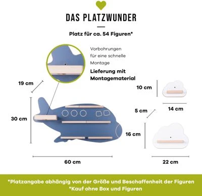 Für alle Fans der beliebten Hörspielbox und für die Flugzeug-Liebhaber*innen kommt hier das passende Regal für die Figuren! Mit dem Regal „Kollektion Flugzeug Wolken“ von BOARTI ist die Musikbox gut aufgeräumt und die passenden Figuren können übersichtlich aufgestellt werden. Was hören wir denn heute? Der Abstellplatz für die Musikbox bietet auch Platz für die Ladestation und auf den freien Flächen finden viele der fröhlichen Hörfiguren Platz. Dank der eingebauten Metallbleche bleiben die magnetischen Figuren an ihrem Platz. Das Regal wird an der Wand montiert.