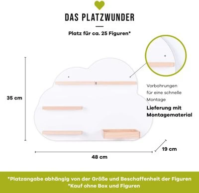 Für alle Fans der beliebten Hörspielbox und für die Wolken-Liebhaber*innen kommt hier das passende Regal für die Figuren! Mit dem Regal „Wolke small“ von BOARTI ist die Musikbox gut aufgeräumt und die passenden Figuren können übersichtlich aufgestellt werden. Was hören wir denn heute? Der Abstellplatz für die Musikbox bietet auch Platz für die Ladestation und auf den freien Flächen finden viele der fröhlichen Hörfiguren Platz. Dank der eingebauten Metallbleche bleiben die magnetischen Figuren an ihrem Platz. Das Regal wird an der Wand montiert.