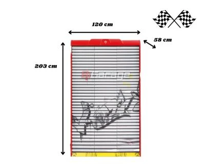 Cooles DesignMit unserem Champ Kleiderschrank bleiben keine Wünsche offen. Der Korpus ist in Rennwagen-Rot lackiert und ist sowohl in der Form als auch in der Gestaltung an einen Werkzeugschrank mit Rolltor in einer Werkstatt angelehnt. Die Lackierung der Front wurde außerdem um einige Feinheiten wie Graffiti und ein Garagenlogo erweitert, um das Gesamtbild abzurunden.