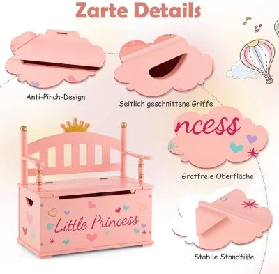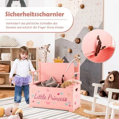 Diese Spielzeugkiste ist eine perfekte Lösung, um fehlenden Stauraum zu kompensieren! Sie bietet nicht nur ausreichend Stauraum für Kinderspielzeug, Bücher, Kleidung, Snacks und Decken. Außerdem bieten die hohe Rückenlehne und die glatten Armlehnen großen Halt und Komfort für Kinder, um sich auf der Bank zu entspannen. Darüber hinaus ist diese Spielzeugtruhe mit ihrem entzückenden Aussehen und praktischen Design ideal für das Schlafzimmer, Spielzimmer, Kinderzimmer und mehr Ihres Kindes.