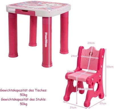 Dies ist ein praktisches Kindermöbel, das Ihrem Kind ein hervorragendes Erlebnis bietet. Unser Set umfasst zwei bequeme Stühle und einen kleinen Tisch. Das umweltfreundliche und sichere PP-Material hat eine ausgezeichnete Haltbarkeit und schadet der Gesundheit Ihres Kindes nicht. Außerdem können die Kinder an diesem Tisch essen, zeichnen, lernen oder spielen und eine glückliche Zeit genießen. Darüber hinaus wurden die Möbel so verarbeitet, dass sie eine gute Stabilität und Balance haben. Der gesamte Montage- und Wartungsprozess ist ebenfalls sehr einfach und leicht, damit Sie Zeit und Energie sparen.