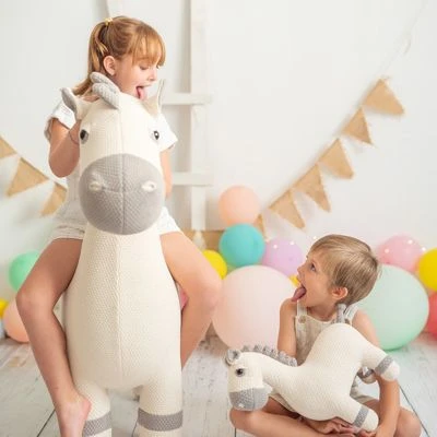 Möchten Sie Ihr Kind mit einem riesigen XXL Plüschtier überraschen? ¡Unser exklusives gehäkeltes Strickstute heißt Hera und möchte der unzertrennliche Begleiter Ihres Kindes werden! Er besteht aus einer Holzstruktur und ist mit Baumwollstoff gepolstert. Er kann ein Gewicht von 70 kg tragen, so dass er zu einem kuscheligen Sitz wird, um ununterbrochen Spaß zu haben. Ein perfektes Geschenk zum Spielen und zur Dekoration des Kinderzimmers! Erhalten Sie hier Hera das Stute in zwei Größen: groß und klein, die ganze Stutefamilie. PRODUKTABMESSUNGEN: peluche maxi 93x34x94 cm. Peluche mini 38x18x42 cm.