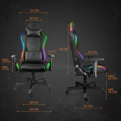 RGB-Beleuchtung mit 332 verschiedenen Modi, die von der mitgelieferten HF-Steuerung gesteuert werden Hochwertiges Kunstleder Stützkissen für die Lendenwirbelsäule und die Kopfstütze höhenverstellbar Angehobene und absenkbare Armlehnen Ergonomisch gestaltet Hydraulikgasventil 5-Punkt-Radstand Nylonräder 90-180 ° schwenkbar Maximalgewicht: 120 kg Empfohlene maximale Länge: 185 cm5 Jahre gemäß den Garantiebedingungenhttps://cdn02.plentymarkets.com/ns1p0u8yc28l/frontend/2022-05-05_DELTACO_Garantiebedingungen.pdf