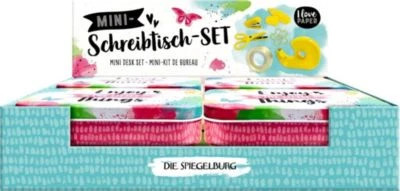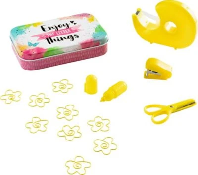 Für mehr Ordnung auf dem Schreibtisch oder auch praktisch zum Mitnehmen: Das Spiegelburg Mini-Schreibtischset in bedruckter Metalldose. Im Set enthalten sind eine Mini-Schere, ein Mini-Textmarker, ein Mini-Tacker inkl. einer Reihe Tackernadeln (Nr. 10), ein Klebeband-Abroller, eine transparente Klebeband-Rolle (1,2 cm x 15 m, Ø 2,5cm) und zehn süße Büroklammern in Blumenform.