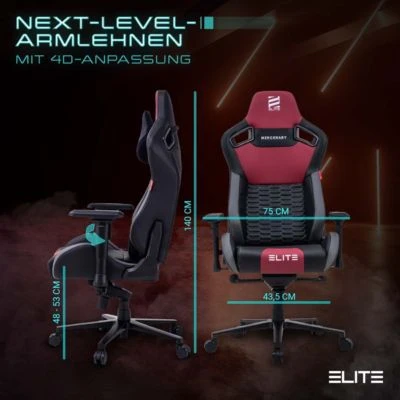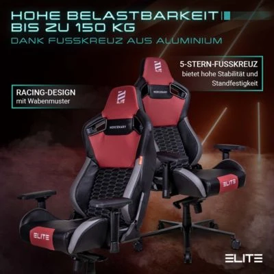 Erfüllt immer seinen Sold. Rückenschmerzen ade! Der Elite Gaming-Stuhl Mercenary ist der perfekte Sitz für lange Gaming-Sessions! Er verfügt über eine Synchronmechanik. Damit können Sie sich auf den Gaming-Stuhl ganz bequem bis zu einem Winkel von 135 Grad nach hinten lehnen. Ob zum Entspannen oder bei ruckartigen Bewegungen in der Aufregung des Spiels: Der Gaming-Chair unterstützt den Rücken der Spieler in jeder Position! Für zusätzlichen Komfort und entspannte Muskeln sorgen die Premium-Kissen für den Nacken und die Lendenwirbelsäule. Sie sind – wie der gesamte PC-Stuhl – leicht zu reinigen. Der Gaming-Chair punktet darüber hinaus mit seinen hochwertigen, strapazierfähigen Bezügen aus Kunstleder. Die Elite-Gaming-Stühle sind äußerst bequem. Insbesondere dank der Sitzfläche aus Memory-Schaum. Dieser stützt den Körper optimal, indem er sich anpasst. Die ausgeklügelte Ergonomie des Bürostuhls umfasst selbstverständlich eine Höhenverstellung des Sitzes. Ebenso lässt sich der Neigungswinkel der Lehne sowie die Armlehnen selbst verstellen. Die 4D-Armlehnen passen sich dabei perfekt an Ihren Körper an und beugen effektiv Reizungen von Muskeln und Sehnen vor. Der Elite Gaming-Stuhl Mercenary ist bis zu 150 kg belastbar und steht sicher auf einem 5-sternigem Fußkreuz aus Aluminium. Auf seinen strapazierfähigen Rollen fährt er dennoch leichtgängig. Dem nächsten Gaming-Abenteuer steht mit diesem Stuhl definitiv nichts mehr im Wege!