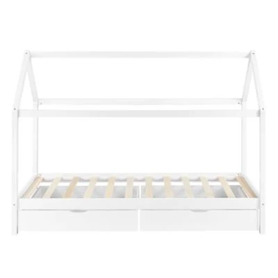 • Kinderbett in Haus-Optik – Stabile Bauweise – Leichte Montage – Mit 2 Schubladen – Material: Kiefernholz – Farbe: Weiß, matt lackiert