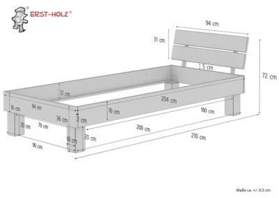 Maße:Liegefläche: 90 x 200 cmAußenmaße: ca. 94 x 210 x 72 cm (B/L/H)Pfosten: ca. 10 x 10 x 20 cm (B/L/H)Sitzhöhe: ca. 36 cmUnterbetthöhe: ca. 20 cmEinlegetiefe: ca. 12 cm