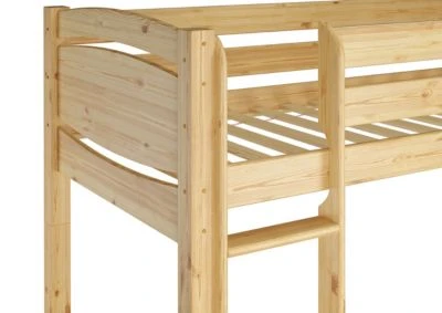Beschreibung:Ein sehr schönes Hochbett, ist teilbar in zwei Einzelbetten.Die ca. 39 cm breite Leiter ist rechts oder links montierbar, extra breite Leiter mit Rillen für eine bessere Sicherheit.Das Holz stammt aus nachwachsend bewirtschafteten Wäldern.Die Oberflächen sind fein geschliffen und und klar lackiert.Das Kiefernholz zeichnet sich durch eine lebendige und sehr schöne Maserung aus.Eine hohe Absturzsicherung am oberen Bett dient einem sicheren und angenehmen Schlaf.Durch die hohe Stabilität dieses Bettes ist es auch sehr gut im gewerblichen Gebrauch einsetzbar.Die Markenbeschläge sorgen für einen leichten Aufbau.