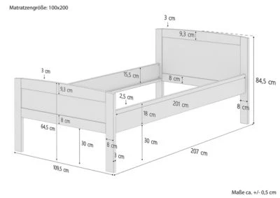 Maße:Pfosten: ca. 30 x 80 mmHöhe Kopfteil: ca. 84,5 cmHöhe Fußteil: ca. 64,4 cmAußenmaße: ca. 109,5 x 207 cm (B/L)Bettkante/Sitzhöhe: ca. 48 cmEinlegetiefe: 15,5 cmUnterbetthöhe: ca. 30 cm