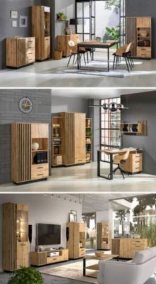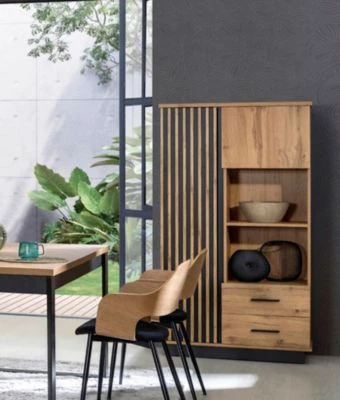 Highboard Modernes Design / Front mit dekorativen Lamellen Ein funktionelles und praktisches Highboard, das Ihnen ausreichend Stauraum für Nützliches bietet. Dieses Highboard lässt sich wunderbar kombinieren. Material: – Korpus & Front: Spanplatte mit laminierter Kunststoffoberfläche – Lamellen: Mitteldichte Faserplatte (MDF) Farbe: Wotan Eiche / schwarz Ausstattung / Abmessungen (ca. Maße): – Kunststoffgriffe in schwarz – Front mit dekorativen Lamellen – 2 Türen, innen 3 Holzböden – 2 Schubladen – 2 offene Fächer – Belastbarkeit der Schubladen: 3kg – Belastbarkeit der Holzböden: 5-7kg – B/T/H: 90cm / 40cm / 159cm