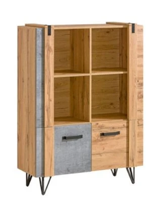 Highboard Modernes Design Ein funktionelles und praktisches Highboard, das Ihnen ausreichend Stauraum für Nützliches bietet. Dieses Highboard lässt sich wunderbar kombinieren. Material: Spanplatte mit laminierter Kunststoffoberfläche, 16mm stark Farbe: Wotan Eiche / Beton Millenium Ausstattung / Abmessungen (ca. Maße): – Griffe aus Kunststoff in schwarz – Füße aus Metall in schwarz – 2 Türen – 4 offene Fächer – Belastbarkeit der Böden: 7kg – B/T/H: 90cm / 41cm / 137cm