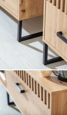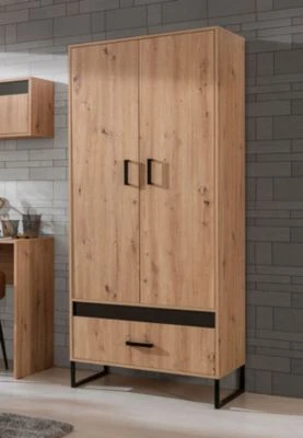 Kleiderschrank Modernes Design Ein besonders attraktiver Kleiderschrank, der mit seinem modernen Design in jedem Zimmer ein Hingucker ist. Dieser Kleiderschrank lässt sich hervorragend kombinieren und individuell nutzen. Im Lieferumfang sind zwei verschiedene dekorative Leisten vorhanden. Sie können bei der Montage entscheiden welche Sie anbringen möchten. Es gibt eine schwarze Leiste und eine Leiste mit Lamellen. (siehe Foto unten) Farbe: Artisan Eiche Material: Spanplatte mit pflegeleichter Kunststoffoberfläche, 16mm Ausstattung / Abmessungen (ca. Maße): – mit ABS-Kanten – Griffe aus Metall – Füße aus Metall, 15,5cm hoch – 2 Türen, innen 1 Boden & 1 Kleiderstange – 1 Schublade mit Vollauszug – B/T/H: ca. 80 cm / 50 cm / 196 cm