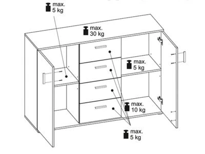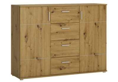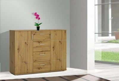Kombikommode praktisch & modern Modernes Sideboard welches sich hervorragend kombinieren lässt. Das elegante Design passt zu vielen Wohnungseinrichtungen und bietet viel Platz für Nützliches und Dekoratives. Farbe: Artisan Eiche Nachbildung Material: Spanplatte mit pflegeleichter laminierter Kunststoffoberfläche Ausstattung / Abmessungen (ca. Maße): – Griffe: Kunststoff, alufarbig – Zierstreifen: Kunststoff, alufarbig – Wandmontage möglich – mit 2 Türen – mit 4 Schubladen – mit 2 Einlegeböden – max. Belastbarkeit vom Einlegeboden ca. 5 kg – max. Belastbarkeit vom Oberboden ca. 30 kg – max. Belastbarkeit vom Unterboden ca. 10 kg – Maße: B/T/H: 132 cm / 39 cm / 91 cm Andere Artikel aus diesem Programm (siehe Bilder unten) finden Sie in unseren weiteren Angeboten!