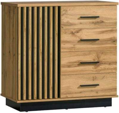 Kommode Modernes Design / Front mit dekorativen Lamellen Eine funktionelle und praktische Kommode, die Ihnen ausreichend Stauraum für Nützliches bietet. Diese Kommode lässt sich wunderbar kombinieren. Material: – Korpus & Front: Spanplatte mit laminierter Kunststoffoberfläche – Lamellen: Mitteldichte Faserplatte (MDF) Farbe: Wotan Eiche / schwarz Ausstattung / Abmessungen (ca. Maße): – Kunststoffgriffe in schwarz – Front mit dekorativen Lamellen – 1 Tür, innen 1 Holzboden – 4 Schubladen – Belastbarkeit der Schubladen: 3kg – Belastbarkeit vom Holzboden: 5kg – Belastbarkeit vom Oberboden: 15kg – B/T/H: 90cm / 40cm / 88cm