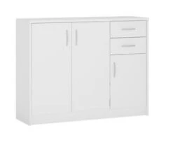 Kommode modernes Design Geräumige und funktionelle Kommode in modernem Design und attraktiver Farbkombination. Diese Kommode lässt sich hervorragend mit anderen Möbelstücken kombinieren und bietet Ihnen viel Stauraum. Material: Faserplatte mit laminierter Kunststoffoberfläche Farbe: weiß Ausstattung / Abmessung (ca. Maße): – 2 Schubladen – 3 Türen – 5 Böden – B/T/H: 109 cm / 35 cm / 85 cm