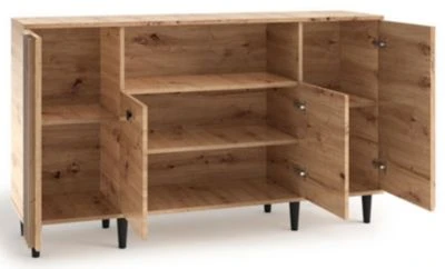 Kommode modernes Design Eine praktische und individuell nutzbare Kommode, die Ihnen viel Stauraum bietet. Die Kommode lässt sich hervorragen mit anderen Möbelstücken kombinieren. Material: laminierte Spanplatte Farbe: Artisan Eiche / schwarz Ausstattung / Abmessung (ca. Maße): – mit ABS-Kanten – dekorative Lamellen – 4 Türen, innen je 1 Boden – 1 offenes Fach – B/T/H: 160 cm / 40 cm / 92,5 cm