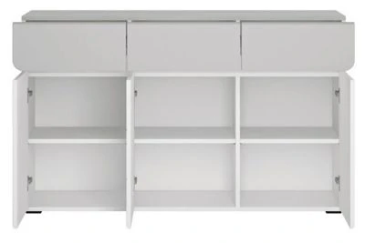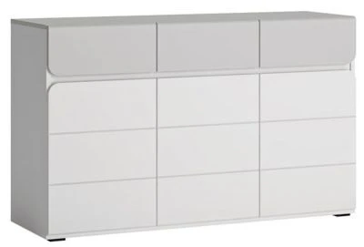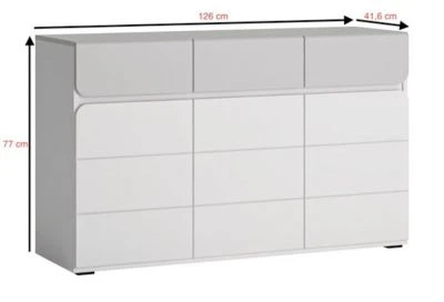 Kommode modernes Design Eine moderne und funktionelle Kommode in harmonischer Farbkombination. Die Kommode lässt sich hervorragend integrieren und bietet Ihnen viel Stauraum. Material: Korpus: Faserplatte mit melaminbeschichtete Kunststoffoberfläche, 16mm stark Front: Mitteldichte Faserplatte (MDF), 16mm stark Farbe: Korpus: weiß / grau Front: weiß / grau Hochglanz Ausstattung / Abmessungen (ca. Maße): – mit ABS-Kanten – Grifflos – abgerundete Ecken – 3 Türen, innen je 1 Boden – 3 Schubladen – Belastbarkeit vom Oberboden: 20kg – Belastbarkeit der Schubladen: 3kg – Belastbarkeit der Einlegeböden: 5kg – B/T/H 126 cm / 41 cm / 77 cm