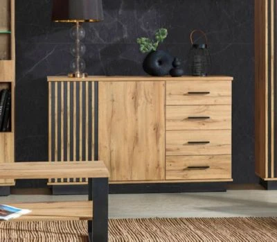Kommode Modernes Design / Front mit dekorativen Lamellen Eine funktionelle und praktische Kommode, die Ihnen ausreichend Stauraum für Nützliches bietet. Diese Kommode lässt sich wunderbar kombinieren. Material: – Korpus & Front: Spanplatte mit laminierter Kunststoffoberfläche – Lamellen: Mitteldichte Faserplatte (MDF) Farbe: Wotan Eiche / schwarz Ausstattung / Abmessungen (ca. Maße): – Kunststoffgriffe in schwarz – Front mit dekorativen Lamellen – 2 Türen, innen 1 Holzboden – 4 Schubladen – Belastbarkeit der Schubladen: 3kg – Belastbarkeit vom Holzboden: 7kg – Belastbarkeit vom Oberboden: 15kg – B/T/H: 141cm / 40cm / 90cm
