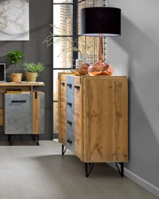 Kommode Modernes Design Eine funktionelle und praktische Kommode, die Ihnen ausreichend Stauraum für Nützliches bietet. Diese Kommode lässt sich wunderbar kombinieren. Material: Spanplatte mit laminierter Kunststoffoberfläche, 16mm stark Farbe: Wotan Eiche / Beton Millenium Ausstattung / Abmessungen (ca. Maße): – Griffe aus Kunststoff in schwarz – Füße aus Metall in schwarz – 2 Türen, innen je 1 Boden – 4 Schubladen – Belastbarkeit der Böden: 5kg – Belastbarkeit der Schubladen: 3kg – B/T/H: 135cm / 41cm / 97cm