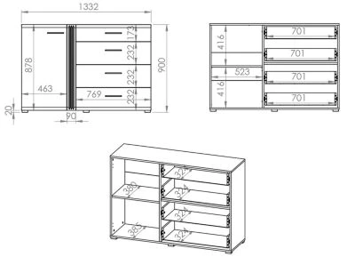 Sideboard Adagio Das moderne und geräumige Sideboard in einer harmonischen Farbkombination bietet Ihnen viel Stauraum und lässt sich hervorragend kombinieren. Material: – Korpus: laminierte Faserplatte – Front: Mitteldichte Faserplatte (MDF) Farbe: – Korpus: Eiche castello – Front: weiß Hochglanz Ausstattung / Abmessung (ca. Maße): – gerillter Einsatz zwischen den Fronten – Fronten nach oben abgerundet – 1 Tür, 4 Schubladen, 1 Einlegeboden – Metallgriffe – Belastbarkeit des Holzeinlegebodens: 10kg – Belastbarkeit der Schubladen: 5kg – B/T/H: 134 cm / 42 cm / 90 cm