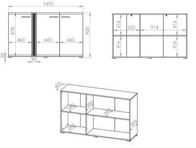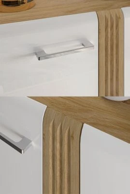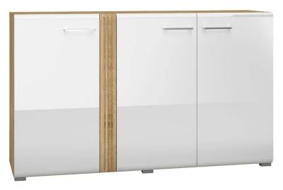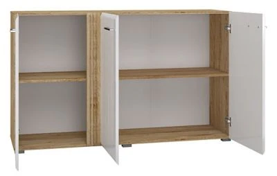 Sideboard Adagio Das moderne und geräumige Sideboard in einer harmonischen Farbkombination bietet Ihnen viel Stauraum und lässt sich hervorragend kombinieren. Material: – Korpus: laminierte Faserplatte – Front: Mitteldichte Faserplatte (MDF) Farbe: – Korpus: Eiche castello – Front: weiß Hochglanz Ausstattung / Abmessung (ca. Maße): – gerillter Einsatz zwischen den Fronten – Fronten nach oben abgerundet – 3 Türen, 2 Einlegeböden – Metallgriffe – Belastbarkeit des Oberbodens: 30kg – Belastbarkeit der Einlegeböden: 10kg – B/T/H: 150 cm / 42 cm / 90 cm