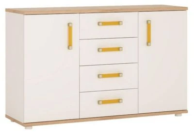 Sideboard junges Design – Jugendprogramm Modernes und funktionelles Sideboard für´s Kinder- oder Jugendzimmer. Die Farbe der Griffe ist wählbar. Das Sideboard lässt sich hervorragend mit anderen Möbelstücken kombinieren und bietet Ihnen ausreichend Stauraum. Die Griffe sind in folgenden Farbausführungen erhältlich: – orange, – limone, – lila oder – opalino (grau) Farbe: Korpus weiß matt / Front weiß hochglänzend – mit Absetzungen (Ober- u. Unterboden) in sanremo eiche Ausstattung / Abmessung (ca. Maße): – 2-türig, innen je 1 Einlegeboden – mittig 4 Schubkästen – B/T/H: 126,2 cm / 40,2 cm / 79,4 cm Material: – Korpus: Faserplatte mit laminierter Kunststoffoberfläche – hochglänzende Front: Mitteldichte Faserplatte (MDF) – Griffe aus Kunststoff Ergänzende Elemente aus dieser Serie (siehe Bild unten) finden Sie in unseren weiteren Angeboten!