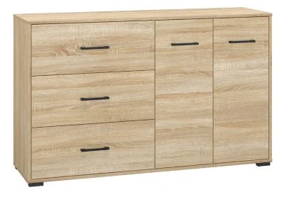 Sideboard Caro Das moderne und geräumige Sideboard bietet Ihnen viel Stauraum und lässt sich hervorragend mit anderen Möbeln dieser Serie kombinieren. Material: – laminierte Faserplatte Farbe: – Korpus/Front: sonoma Eiche hell Ausstattung / Abmessung (ca. Maße): – 2 Drehtüren, 3 Schubladen, 1 Einlegeboden – schwarze Kunststoffgriffe – Belastbarkeit des Einlegebodens: 10kg – Belastbarkeit der Schubladen: 5kg – B/T/H: 138 cm / 40 cm / 85 cm