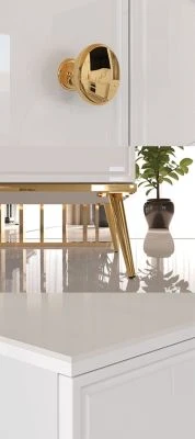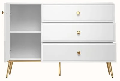 Sideboard Goldin Das moderne und geräumige Sideboard bietet Ihnen viel Stauraum und lässt sich hervorragend kombinieren. Material: – Korpus: laminierte Faserplatte – Fronten: Mitteldichte Faserplatte (MDF) Farbe: – Korpus: weiß matt / Bodenplatte gold – Fronten: weiß Hochglanz Ausstattung / Abmessung (ca. Maße): – goldene Bodenplatte – 1 Drehtür, 1 Einlegeboden, 3 Schubladen – goldene Metallknopfgriffe und Metallfüße – Schubladen mit soft close – Belastbarkeit des Einlegebodens: 10kg – Belastbarkeit der Schubladen: je 5kg – B/T/H: 120 cm / 40 cm / 85 cm Passende Artikel aus dieser Serie finden Sie in unseren weiteren Angeboten (siehe Bilder unten)!