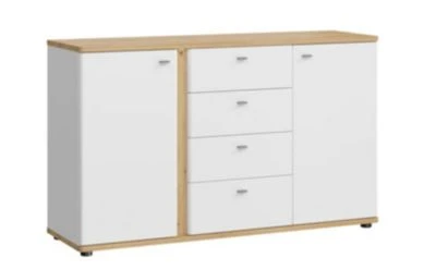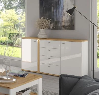 Sideboard modernes Design Geräumiges und funktionelles Sideboard in eleganter Farbkombination. Das Sideboard ist die perfekte Kombination aus Funktionalität und modernem klaren Design. Bei der Beleuchtung handelt es sich um eine Effektbeleuchtung (weniger als 30 Lumen), die Beleuchtung dient nicht zur Erhellung des Raums. Material: – Korpus: Faserplatte mit pflegeleichter laminierter Kunststoffoberfläche – Front: Mitteldichter Faserplatte (MDF) Farbe: – Korpus: Eiche Artisan / weiß matt – Front Eiche Artisan / weiß Hochglanz Ausstattung / Abmessung (ca. Maße): – 2 Türen, innen je 1 Einlegeboden – 4 Schubladen mit Soft-Close Funktion – mit Beleuchtung – Belastbarkeit vom Oberboden: 25kg – Belastbarkeit der Schubladen: 3kg – Belastbarkeit der Einlegeböden: 5kg – B/T/H: 144 cm / 42 cm / 87 cm Passende Artikel aus dieser Serie (siehe Bilder unten) finden Sie in unseren weiteren Angeboten!