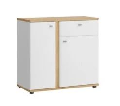 Kommode modernes Design Geräumige und funktionelle Kommode in eleganter Farbkombination. Die Kommode ist die perfekte Kombination aus Funktionalität und modernem klaren Design. Bei der Beleuchtung handelt es sich um eine Effektbeleuchtung (weniger als 30 Lumen), die Beleuchtung dient nicht zur Erhellung des Raums. Material: – Korpus: Faserplatte mit pflegeleichter laminierter Kunststoffoberfläche – Front: Mitteldichter Faserplatte (MDF) Farbe: – Korpus: Eiche Artisan / weiß matt – Front Eiche Artisan / weiß Hochglanz Ausstattung / Abmessung (ca. Maße): – 2 Türen, innen je 1 Einlegeboden – 1 Schublade mit Soft-Close Funktion – mit Beleuchtung – Belastbarkeit vom Oberboden: 15kg – Belastbarkeit der Schublade: 3kg – Belastbarkeit der Einlegeböden: 5kg – B/T/H: 94 cm / 42 cm / 87 cm Passende Artikel aus dieser Serie (siehe Bilder unten) finden Sie in unseren weiteren Angeboten!