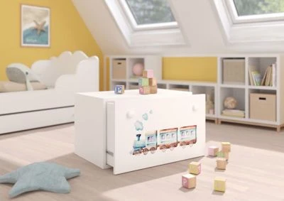 Spielzeugtruhe mit Motiv modernes Design / Motiv wählbar Eine moderne und funktionelle Spielzeugtruhe mit niedlichen Motiven. Die Spielzeugtruhe lässt sich prima kombinieren und bietet viel Stauraum folgende Motive sind erhältlich: – Ballerina – Ballerina mit Einhorn – Zug – Rennauto – Dinos – Galaxy – Einhorn – Bagger – Katze – Fee – Teddybär – Princess – Polizeiauto – Flugzeug – Elefant – Meerjungfrau – Prinzessin – Meerestiere Farbe: weiß Material: laminierte Faserplatte Ausstattung / Abmessungen (ca. Maße): – Maße: B/T/H: 70 cm / 41 cm / 41 cm – 1 Schublade – Holzgriffe in weiß