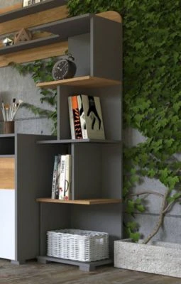 Standregal Modernes Design Ein funktionelles und praktisches Standregal, das Ihnen ausreichend Stauraum für Nützliches bietet. Dieses Standregal lässt sich wunderbar kombinieren. Material: Spanplatte mit laminierter Kunststoffoberfläche Farbe: graphit hell / Nash Eiche Ausstattung / Abmessungen (ca. Maße): – 6 Fächer – B/T/H: 35cm / 35,5cm / 153cm