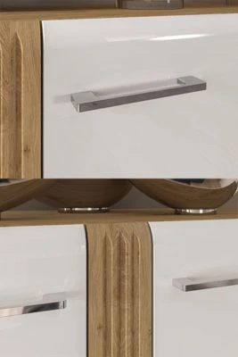 Stauraumvitrine Adagio Die moderne und geräumige Stauraumvitrine in einer harmonischen Farbkombination bietet Ihnen viel Stauraum und lässt sich hervorragend kombinieren. Material: – Korpus: laminierte Faserplatte – Front: Mitteldichte Faserplatte (MDF), Glas Farbe: – Korpus: Eiche castello – Front: weiß Hochglanz Ausstattung / Abmessung (ca. Maße): – gerillter Einsatz zwischen den Fronten – Fronten nach oben abgerundet – 1 Glastür, 1 Holztür, 5 Holzeinlegeböden, 2 Glaseinlegeböden – silberne Metallgriffe – Belastbarkeit der Holzeinlegeböden: 5kg – Belastbarkeit der Glaseinlegeböden: 3kg – ohne Beleuchtung – B/T/H: 92 cm / 42 cm / 143 cm