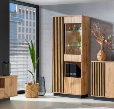 Stauraumschrank Modernes Design / Front mit dekorativen Lamellen Ein funktioneller und praktischer Stauraumschrank, der Ihnen ausreichend Stauraum für Nützliches bietet. Dieser Stauraumschrank lässt sich wunderbar kombinieren. Material: – Korpus & Front: Spanplatte mit laminierter Kunststoffoberfläche – Lamellen: Mitteldichte Faserplatte (MDF) Farbe: Wotan Eiche / schwarz Ausstattung / Abmessungen (ca. Maße): – Kunststoffgriffe in schwarz – ohne Beleuchtung – Front mit dekorativen Lamellen – 2 Türen, innen 1 Boden & 1 Kleiderstange – 1 Schublade – Belastbarkeit der Schublade: 3kg – Belastbarkeit der Kleiderstange: 15kg – Belastbarkeit vom Einlegeboden: 7kg – B/T/H: 90cm / 52cm / 193cm