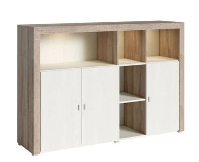 Kommode Rahmen-Optik Besonders attraktive Kommode, die mit ihrer schlichten Eleganz in jedes Zimmer passt. Diese Kommode lässt sich hervorragend kombinieren und individuell nutzen. Farbe: sonoma eiche trüffel / sibiu lärche Material: Spanplatte mit melaminbeschichtete Kunststoffoberfläche Ausstattung / Abmessungen (ca. Maße): – alufarbene Kunststoffgriffe – ohne Beleuchtung – 3 Türen – 5 offene Fächer – Belastbarkeit der Böden: 5kg – Belastbarkeit vom Oberboden: 20kg – B/T/H: 163 cm / 37 cm / 109 cm
