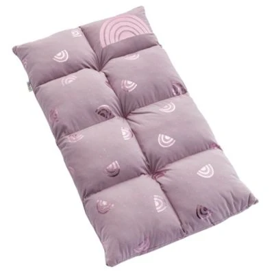 Der Kindersessel ist aus hochwertigem Baumwollstoff im modernem rosa Farbdesign genäht. Das Besondere sind die herrlich glänzenden kleinen Regenbogen und Punkte über den Stoff verteilt.