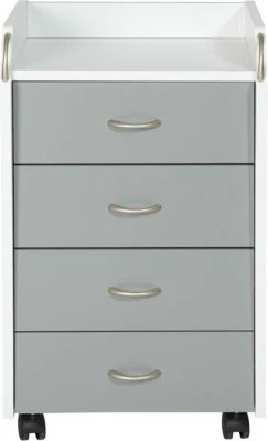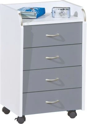 Dieser Rollcontainer von Inter Link dient als praktische Aufbewahrungsmöglichkeit zum Beispiel für Formulare, Büromaterial oder andere wichtige Utensilien. Zusätzlich zu den vier Schubladen mit Bügelgriffen befindet sich oben eine Ablage, die mit Abgrenzungen an drei Seiten ausgestattet ist. Dank der vier Rollen mit schützenden Abdeckungen lässt sich der Rollcontainer problemlos verschieben.