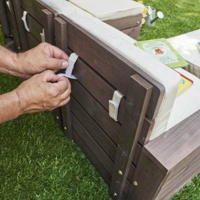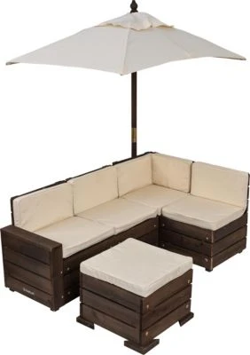 Mit diesem Outdoor-Sectional Set von KidKraft haben die Kinder eine so gemütliche und stilvolle Sitzecke im Garten, dass selbst die Erwachsenen neidisch werden. Die Ottomane kann direkt an die Sitzgruppe geschoben werden, damit man darauf die Beine ausstrecken kann, oder als Tisch genutzt werden. Wenn es in der Sonne zu heiß ist, wird einfach der passende Sonnenschirm aufgespannt.