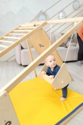 Wenn man die Seile in die vorgesehenen Löchern anbringt, hat man eine Hängeschaukel für das Klettergerüst.