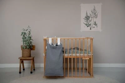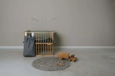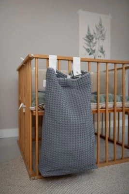 Koeka stellt Laufstallzubehör in verschiedenen Materialien, Stilen und Farben her, so dass jeder ein Produkt nach seinem Geschmack finden kann. Meistens steht der Laufstall im Wohnzimmer, daher ist es schön, wenn das Laufstallzubehör zur Einrichtung passt. In dieser praktischen Laufgittertasche können Sie alles aufbewahren, was Sie wollen. Spielzeug, Windeln, Kleider, Kuscheltiere; alles, was den Laufstall zu voll macht oder worüber Sie lieber nicht stolpern möchten, können Sie darin aufbewahren. Die Aufbewahrungstasche lässt sich mit zwei Schlaufen mit Druckknöpfen einfach am Laufstall oder am Bett befestigen. Man kann den Laufgitterbeutel oben mit einem in der Mitte angebrachten Band verschließen. Der Laufgitterbeutel hat einen verstärkten losen Boden, der vor dem Waschen entfernt werden muss.
