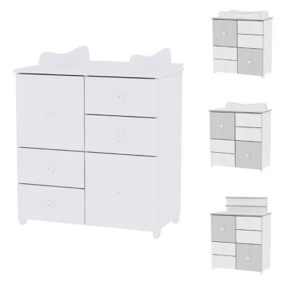 Die Kommode Cupboard aus dem Hause Lorelli ist ideal für jedes Kinderzimmer. Sie verfügt über vier Schubladen und zwei Schranktüren mit Regalfächern, die genügend Stauraum für Klamotten oder Spielsachen bieten. Die Kommode ist in mehreren Varianten nutzbar. Sie kann sowohl als Wickelplatz verwendet werden, den Sie längs oder quer nutzen. Oder als Kommode mit schönem Rückenteil oder zusätzlichem Regal für mehr Ablagefläche.