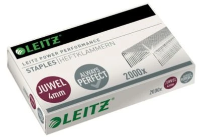 Leitz Heftklammern Juwel 4 mm, verzinkt, für Heftzange Juwel, Juwel 2000 und Juwel 3000. Material: Draht, verzinkt. Inhalt: 2000 Stück. Maße: 4 mm x 7 mm