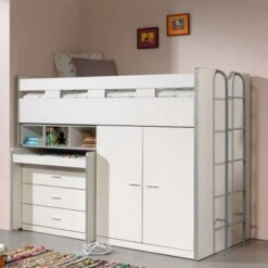 • Modernes Hochbett mit Schreibtisch und Stauraum in weiß matt; Liegefläche: 90×200 cm