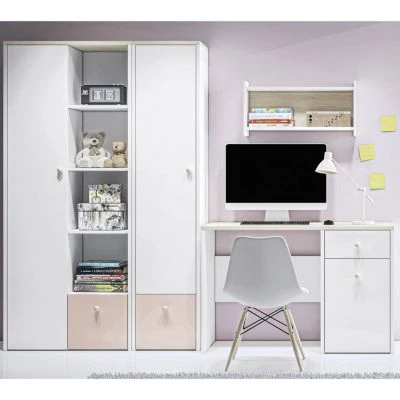 Set Kinderzimmer mit Schreibtisch ELVA-131 in Alpenweiß mit Fjord Buche Nb. und hellrosa