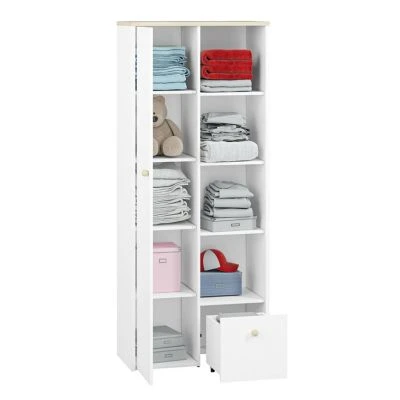 1 Schrank mit 1 Tür, 1 Schubkasten mit Rollen, 4 offenen Fächern, 8 Einlegeböden, B/H/T: ca. 80/193/40 cm