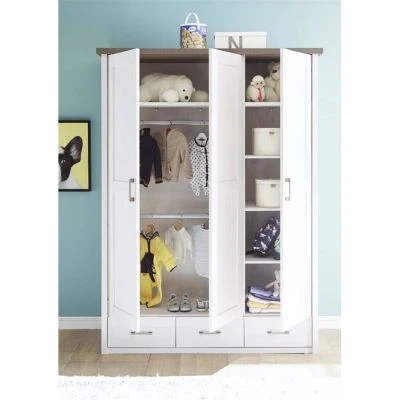 • 3 Drehtüren mit Soft-Close-Funktion, 3 Schubkästen, 5 Holzböden, 2 Kleiderstangen, Griffe aus Metall in altsilber