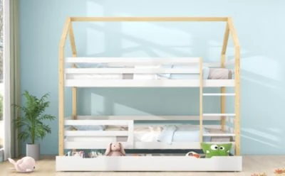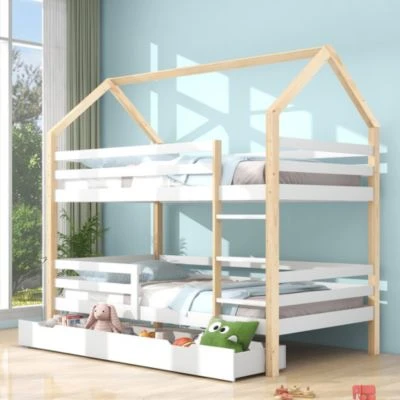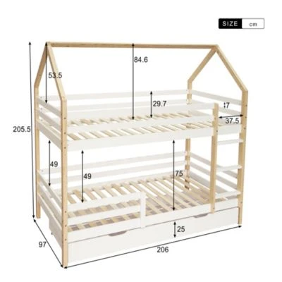 【Elegantes Design】Die Form des niedlichen kleinen Hauses kann Kindern ein warmes Schlaferlebnis bescheren. Das Design des Etagenbettes stellt Familien mit vielen Kindern zufrieden. Die Kombination aus Holzfarbe und Weiß kann das Kinderzimmer wärmer machen.