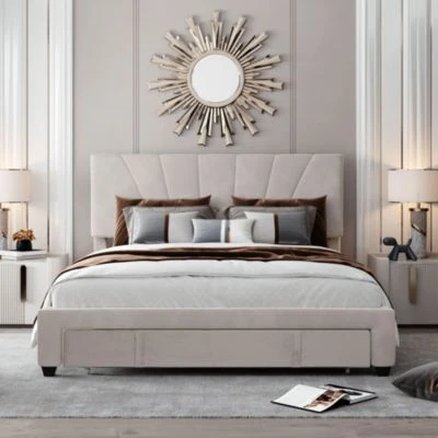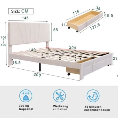 Dieses einfache und moderne gepolsterte Bettgestell ist in zwei Ausführungen erhältlich, beige und grau. Klassische Farboptionen ergänzen jedes Möbeldekor. Es besteht aus einem Kopfteil und einer niedrigen Fußstütze, komplett mit Latten. Aufbewahrungsschubladen können verwendet werden, um Kleidung, zusätzliche Laken und mehr zu organisieren. Der hautfreundliche Flanellstoff sorgt für ein kuscheliges Kuschelgefühl und der übergroße Stauraum macht dieses gepolsterte Bettgestell zu einer tollen Wahl für alle, die ihren Platz gerne optimal nutzen